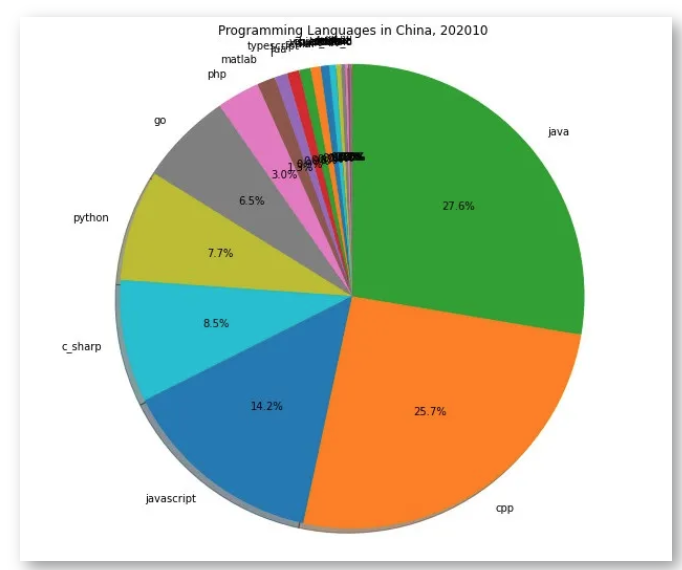 从编程语言角度来说,JAVA、C++(图中cpp)、JavaScript、C#(图中的c_sharp)、Python、GO等编程语言市场占有率较高。
